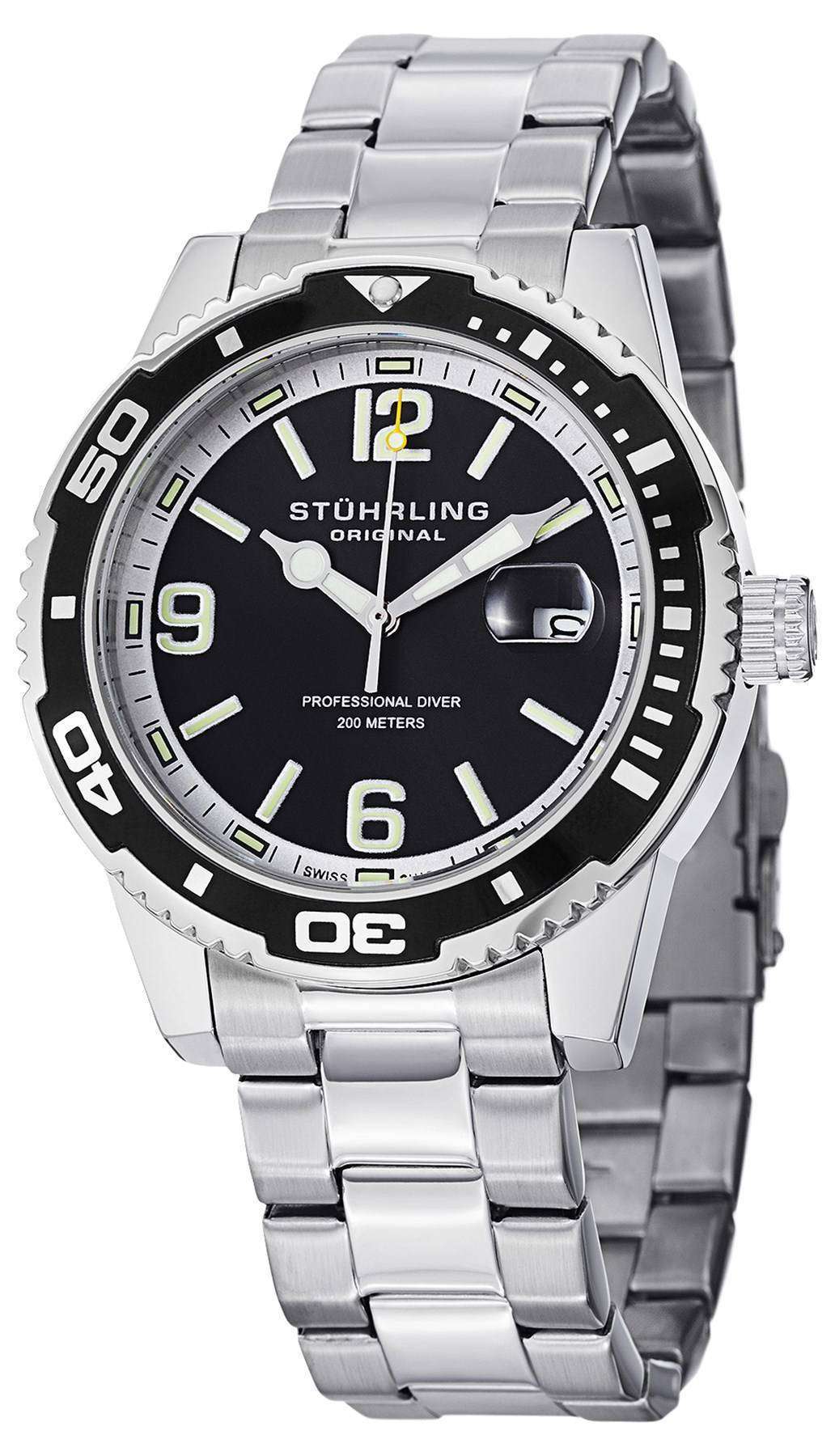 Stuhrling Original Regatta Aquadiver 200M Swiss Quartz Black Dial 415.01 Mens Watch